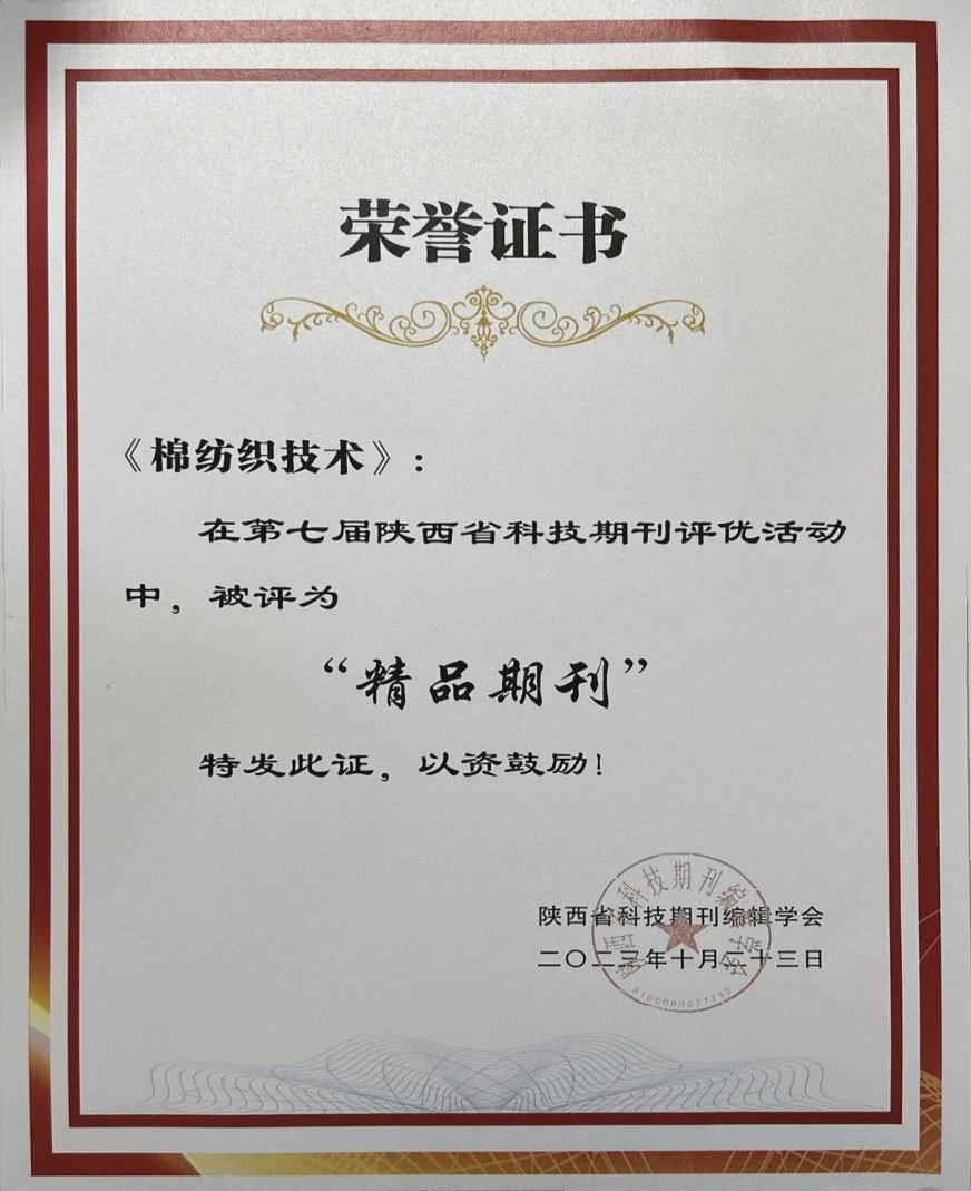 紡科院下屬《棉紡織技術(shù)》期刊榮獲“陜西省科技期刊精品獎(jiǎng)”
